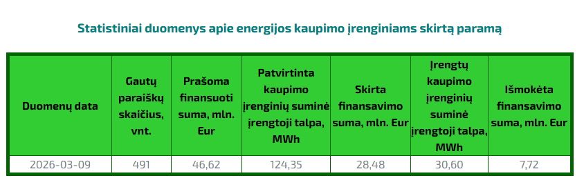 Iš šios sumos jau patvirtinta 28,48 mln. eurų finansavimo, o patvirtintų kaupimo įrenginių bendra talpa sudaro apie 124,35 MWh. Tuo pačiu metu jau įrengtų energijos kaupimo sistemų talpa siekia apie 30,60 MWh, o išmokėta paramos suma – apie 7,72 mln. eurų.
